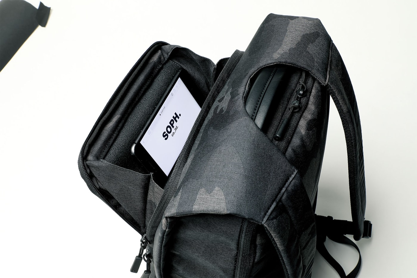 『SOPH.shops』『SOPH. ONLINE STORE』限定となるカモフラージュ柄と、『ace.直営店』『ace. オンラインストア』『新宿伊勢丹百貨店』限定となるソリッドなブラック、ネイビーの3色展開。3月7日(土)より販売開始。※SOPH. ONLINE STOREのみ3月9日(月)発売