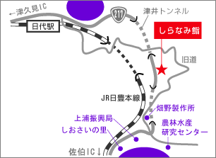 - 佐伯I.C.より国道217号線を北上。殿山トンネルを過ぎてすぐ右手にあります。(30分)